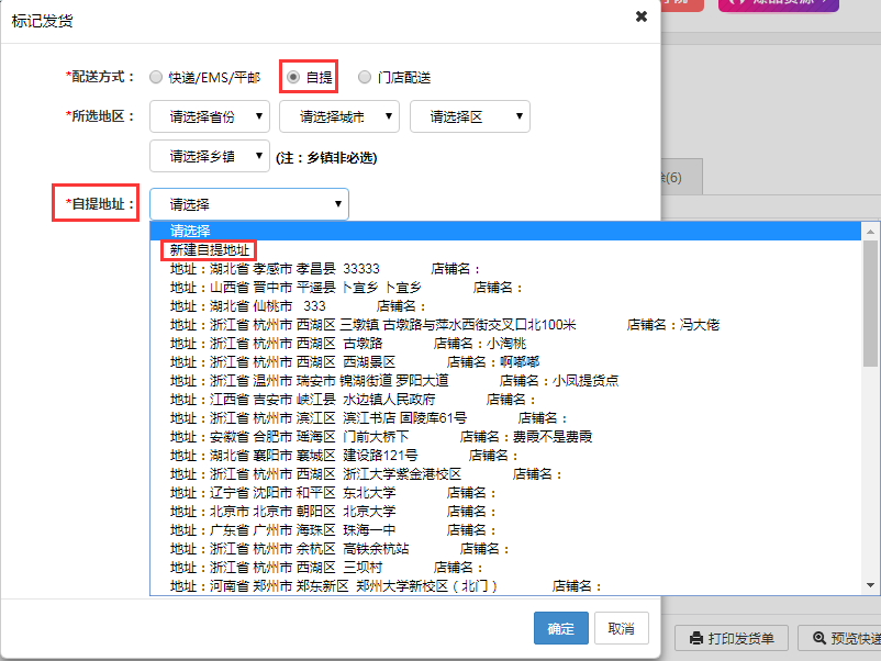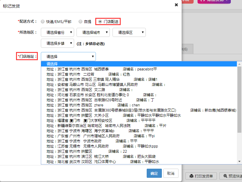 積分兌換商品訂單標(biāo)記發(fā)貨時可以選擇“自提”和“門店配送