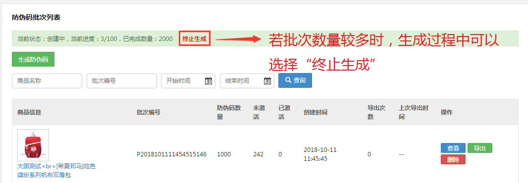 ②生成好的防偽碼商品,可以在列表查詢和導出
