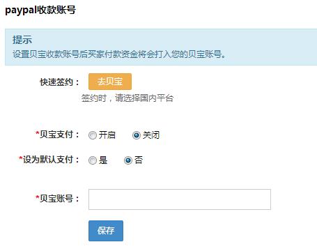 設置貝寶收款賬號后買家付款資金將會打入您的貝寶賬號。并且要點擊開啟再點擊保存。