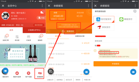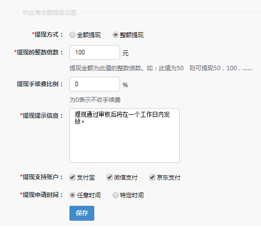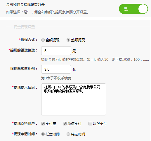 提現設置:用戶可設置提現方式,也可設置提現最低金額,達到該金額后才可提現,同時也可根據需求設置提現支持的賬戶,這個也是必填項