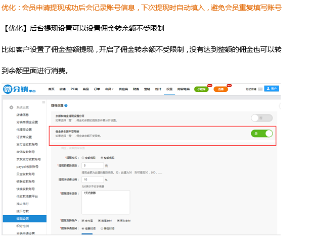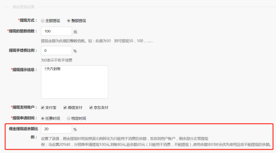 操作步驟: 總部后臺→設置→系統設置→提現設置:傭金提現增加“傭金提現返余額比例”的設置項。設置了“傭金提現返余額比例”后商家可以設置一種新的提現方式: 比如:當商家設置“傭金提現返余額比例”為20%時,分銷商申請提現100元,則實際到賬80元,另外20以余額的形式返給會員,這部分余額只能用來消費,不能提現,使用余額支付時會優先使用這些不能提現的余額(如果使用了該部分余額消費,退貨后,原路返回,該部分余額還是只能用于消費)。
