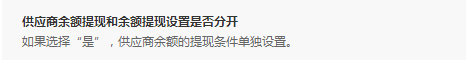 操作步驟: 總部后臺→設置→系統設置→提現設置:增加“供應商余額提現和余額提現設置是否分開”,如果選擇“是”,供應商余額的提現條件單獨設置;選擇“否”,供應商余額提現按照后臺會員余額提現的規則。