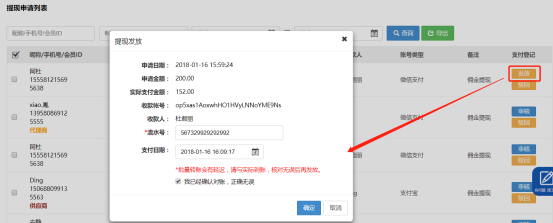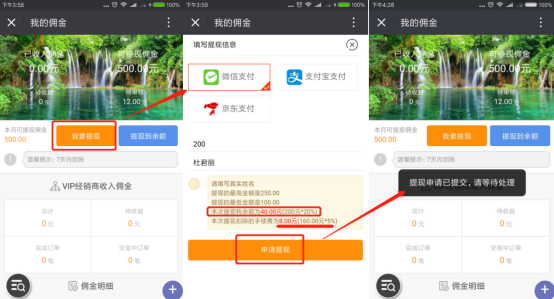 ①手機端分銷商A提現操作,申請微信提現200元,如下圖: