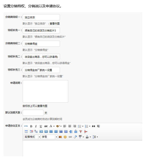 分銷商申請(qǐng)的申請(qǐng)條件顯示頁(yè)面用戶可以自定義編輯,備注信息也可以自己增加條數(shù)