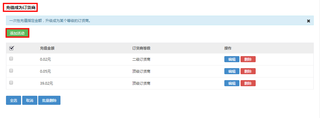充值不成功限制條件:1.不允許訂貨商自動升級;2.已經是代理商的不能升級成為訂貨商;3.當前等級大于升級等級,不允許升級。