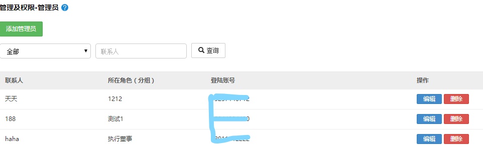 管理員權(quán)限:可以通過權(quán)限角色進(jìn)行搜索管理員,也可以直接查找聯(lián)系人進(jìn)行查詢。