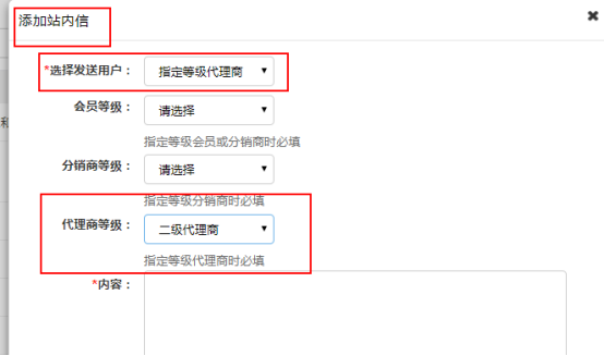 站內(nèi)信群發(fā)增加選擇代理商等級(jí) 操作步驟: 總部后臺(tái)→營(yíng)銷→消息群發(fā):站內(nèi)信群發(fā)增加選擇代理商等級(jí)。