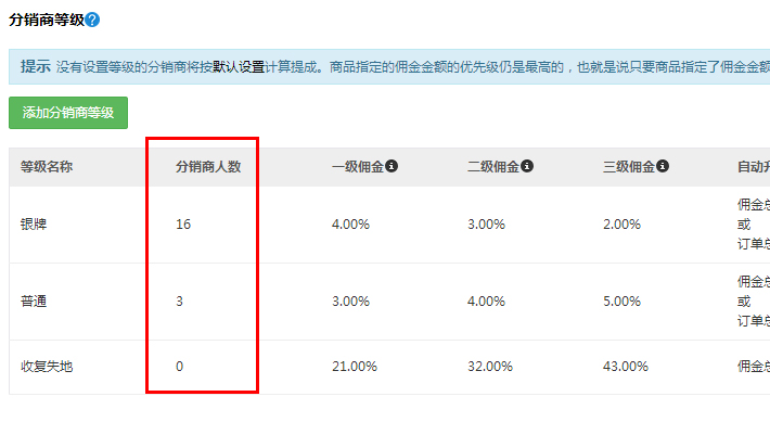 分銷商等級可以用戶自己進行添加,可以設置一個相應等級對應相應傭金的特權,升級可以根據傭金的多少或者訂單總額達到多少來考量。