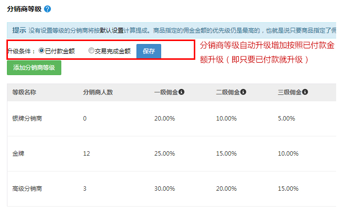 分銷商等級自動升級條件分為”已付款金額“和”交易完成金額“兩種