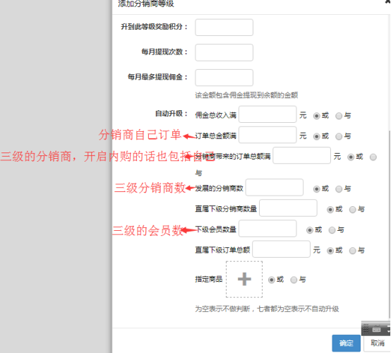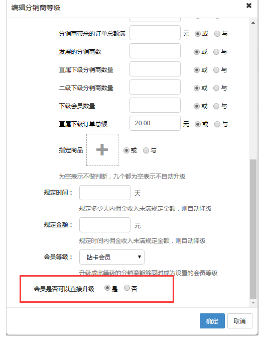 分銷商等級增加“會員是否可以直接升級”的設置 如果選擇是,會員滿足條件將自動成為該等級的分銷商