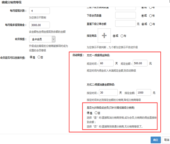 ① 根據消費金額降級:指定時間未達到指定金額的分銷商,降低分銷商等級 ② 分銷等級最低時,沒達到規定時間里規定金額的條件,可以設置是否直接取消其分銷商資格降為會員。