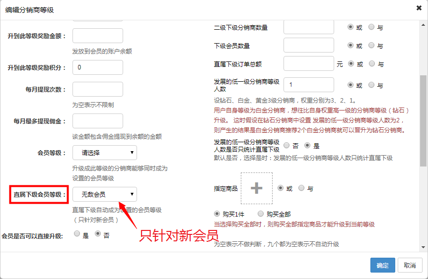分銷商等級里可以設置該等級的分銷商發展進來的直屬下級自動成為某個會員等級(只針對新會員)