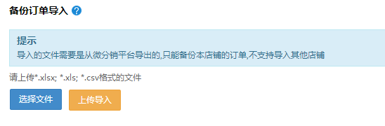 備份訂單導入數據只支持微分銷系統(tǒng)的備份數據,不支持其他店鋪的數據導入。請按系統(tǒng)提示的文件格式上傳。如下圖所示: