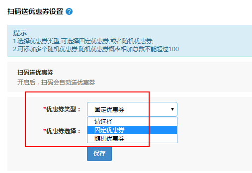 ① 掃碼送優(yōu)惠券加一個配置項,可以選擇固定優(yōu)惠券或者隨機優(yōu)惠