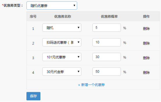 ② 當選擇隨機優(yōu)惠券之后,加一個優(yōu)惠券多選按鈕,選中優(yōu)惠券后面跟上對應抽中概率,掃碼后,根據(jù)概率發(fā)放隨機優(yōu)惠券