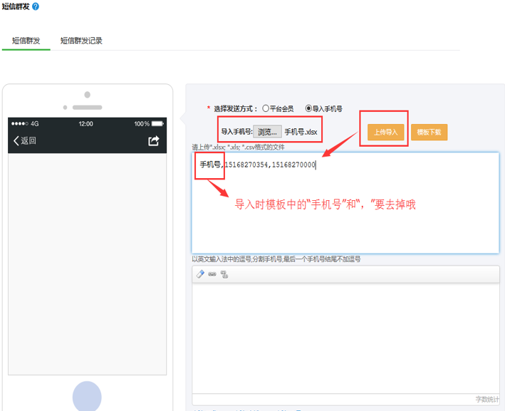 短信群發(fā)增加一個導(dǎo)入手機號功能 ① 導(dǎo)入前驗證手機號,過濾非法手機號 ② 導(dǎo)入的手機號只發(fā)送短信,不會成為店鋪會員