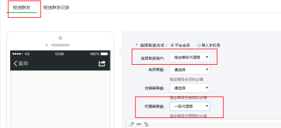 短信群發(fā):可選擇指定的分銷商及指定等級的分銷商群發(fā)消息,消息中有快捷鏈接形式提供給客戶插入昵稱、插入店鋪、插入會員個數(shù)