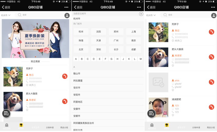 可自動定位到所在省份,并選出附近的5個門店列表。目前只有第42套模板才有門店定位功能。
