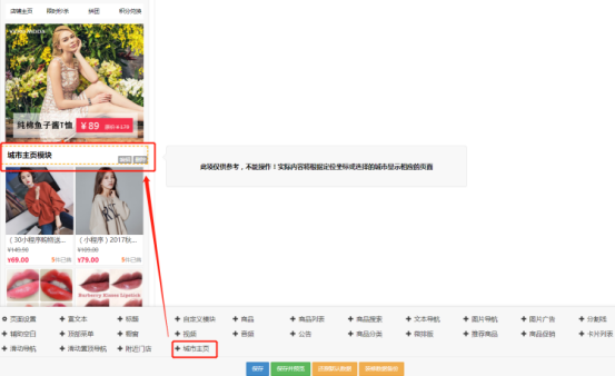 操作步驟: 用于第42號套模版切換城市時顯示不一樣的頁面 總部后臺→店鋪→店鋪管理→店鋪主頁:選擇第42套主頁裝修模板,編輯店鋪主頁時,增加“設(shè)置城市主頁”和“城市主頁”裝修組件的功能。42套模板城市主頁增加設(shè)置默認城市主頁。