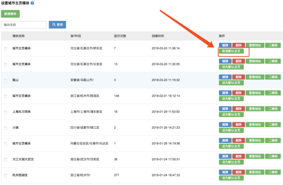 ①點擊設(shè)置城市主頁按鈕,進入城市主頁列表頁,可進行添加、編輯、刪除操作(相關(guān)操作同自定義模板);
