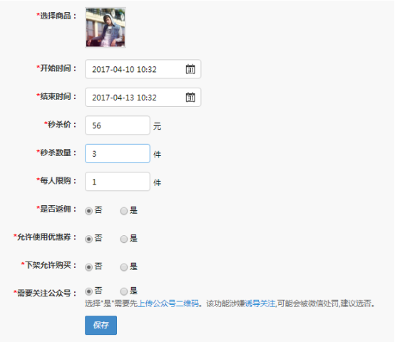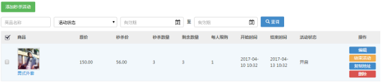 設置秒殺活動,點擊”添加秒殺活動“按鈕,進行活動相關信息的設置,保存即可返回活動列表進行查看。如下圖所示: