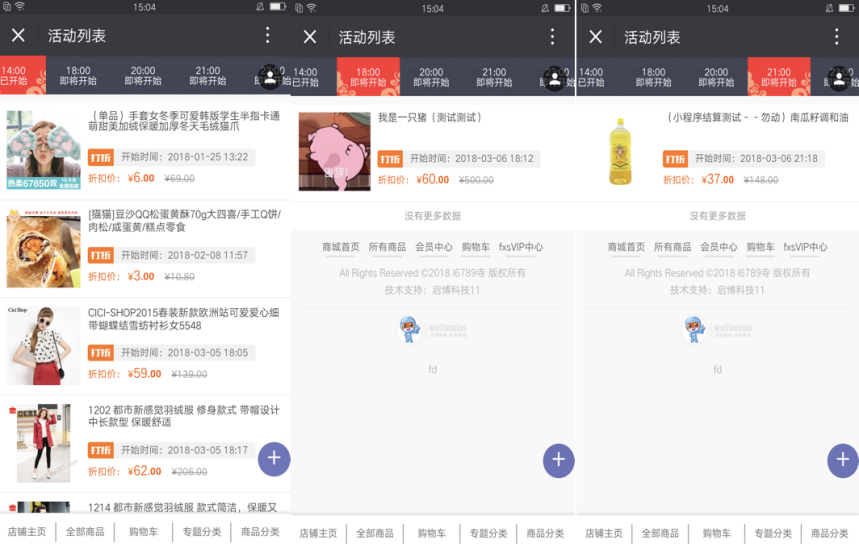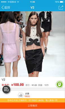 如果活動已經開始,活動狀態就會顯示開啟,活動操作中就會顯示“結束活動”,手機端底部顯示”立即購買“按鈕。如果活動未開始狀態,活動操作中就會顯示“開始活動”;如果要結束活動,可以點擊結束活動點擊。前端顯示效果如下圖所示: