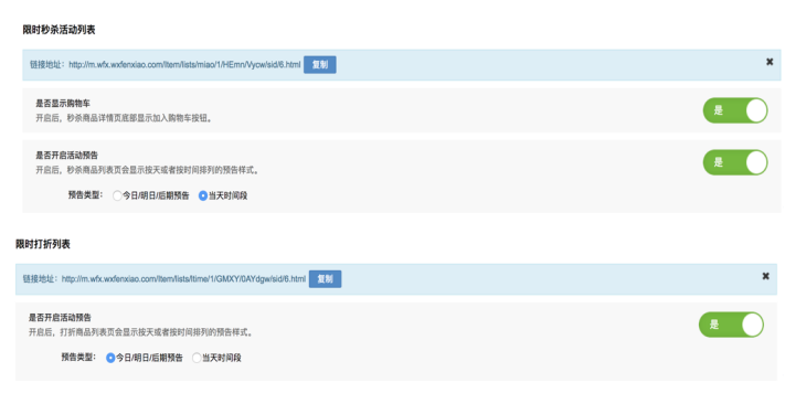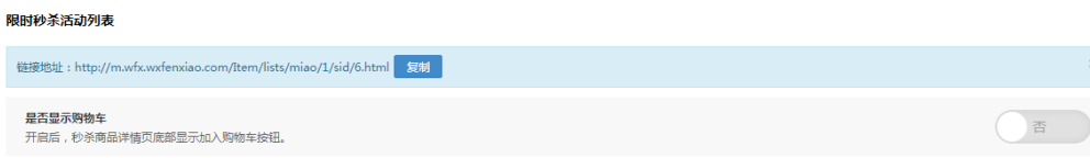 ·總部后臺→營銷→吸粉營銷→限時秒殺:秒殺活動列表增加“是否顯示購物車”,開啟后,秒殺商品詳情頁底部顯示加入購物車按鈕。