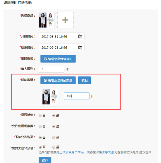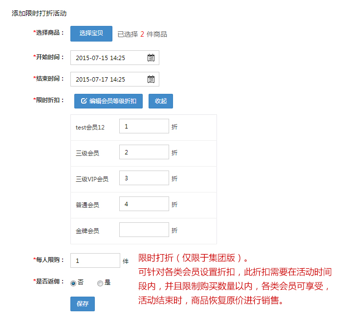 限時打折(僅限于集團版):可針對各類會員設置折扣,此折扣需要在活動時間段內(nèi),并且限制購買數(shù)量以內(nèi),各類會員可享受,活動結(jié)束時,商品恢復原價進行銷售