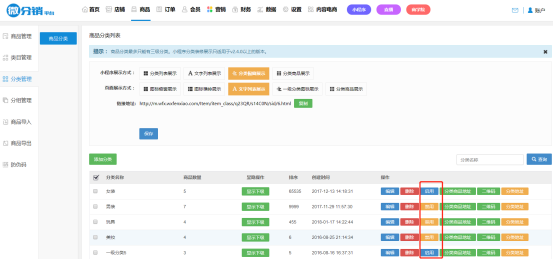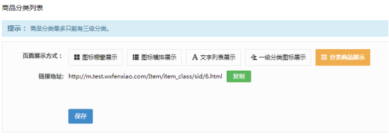 商品分類最多只能添加三級(jí)。顯示方式分為五種:圖標(biāo)櫥窗展示、圖標(biāo)橫排展示、文字列表展示、一級(jí)分類圖標(biāo)展示和分類商品展示。