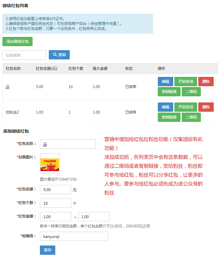 使用此功能,需要使用紅包功能需上傳微信API證書,上傳證書請前往設置->店鋪信息->支付設置上傳apiclient_key,apiclient_cert;確保微信賬戶里的資金充足(可在微信商戶后臺->資金管理中充值);紅包個數與紅包金額,只要一個達到條件,紅包將停止發送。