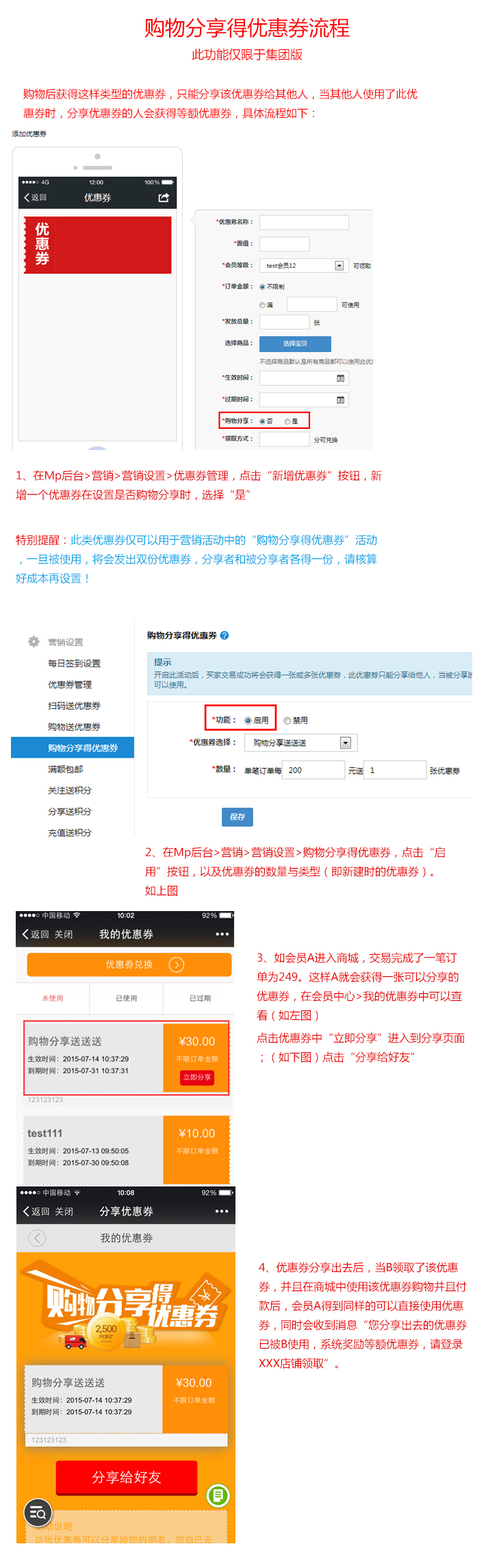購物分享得優惠劵流程(此功能僅限集團版):購物后獲得這樣類型的優惠劵,只能分享該優惠劵給其他人,當其他人使用了此優惠劵時,分享優惠劵的人會獲得等額優惠劵。