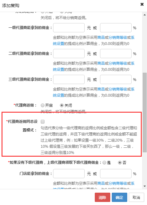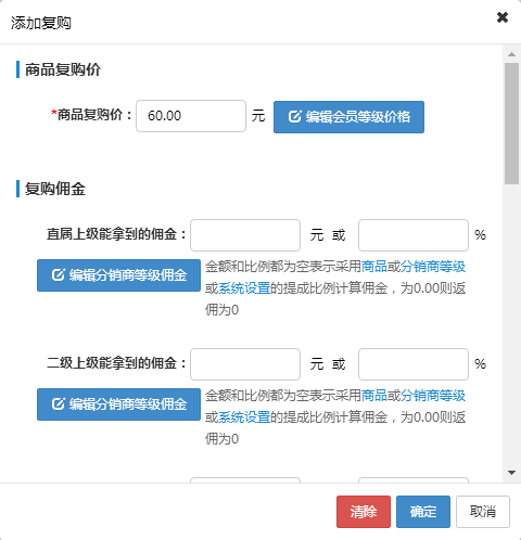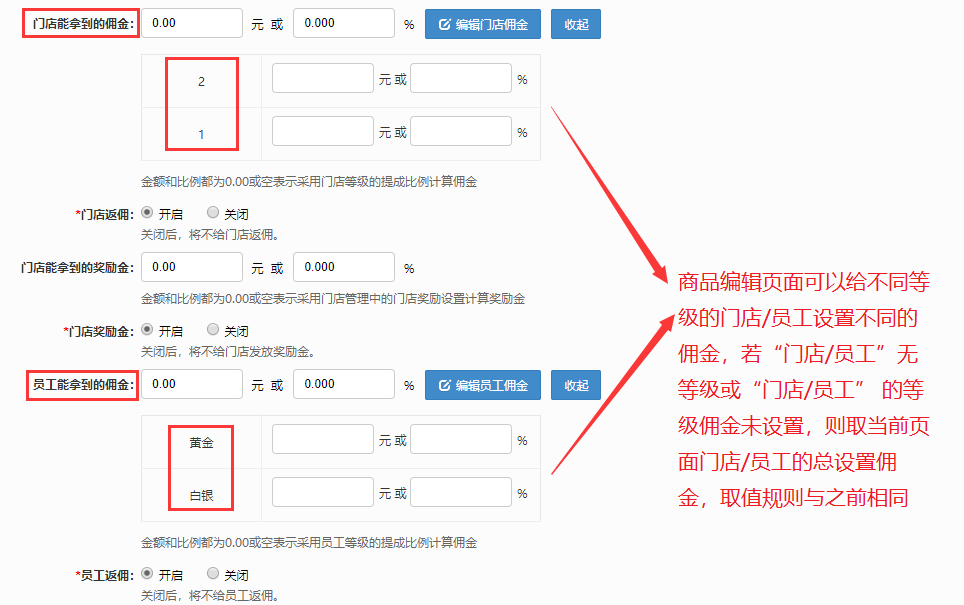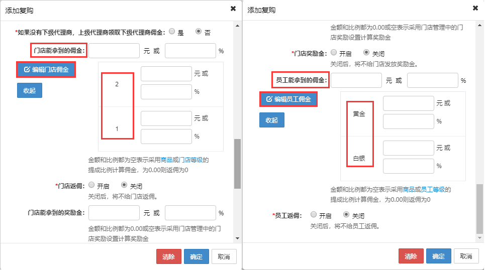 7.編輯商品和復購的地方可以給不同的門店和員工等級設置不同的傭金