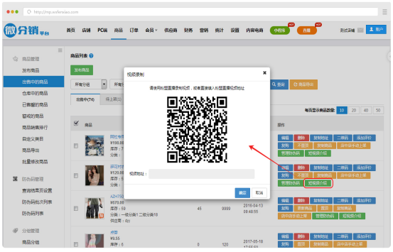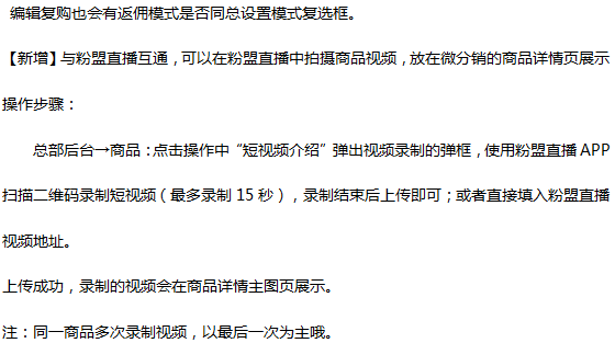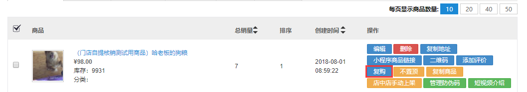 上圖紅框中,點擊可隨時編輯商品的標題、價格、庫存、分類等信息,不用進入編輯頁面可直接修改。單品操作主要有:編輯、刪除、復制地址、查看二維碼、添加評論,復購,置頂設置、復制商品、店中店手動上架、恢復店中店上架、管理防偽碼和短視頻介紹。比如管理員想要對此商品進行添加相關評論,即可點擊“添加評論”按鈕,進行評論的相關添加。 這里只說一下復購,點擊復購,彈出復購頁面,如下圖