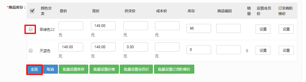 8.編輯商品批量設置增加全選和勾選功能,以便對個別幾個sku進行批量設置