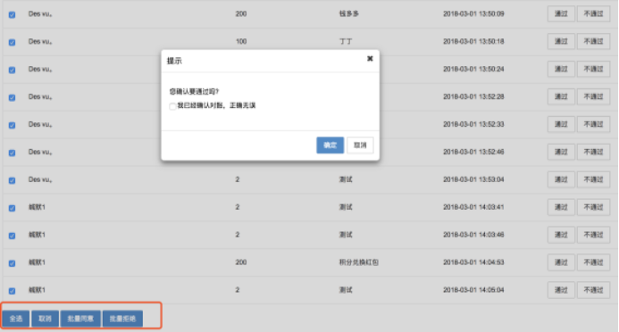操作步驟: 營銷->積分兌換紅包->審核列表 增加全選,取消,批量同意,批量拒絕按鈕,同意通過后會返回顯示通過幾條的提示。 提交批量同意或者拒絕會提示需勾選“我已經確認對賬,正確無誤“選項。