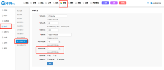 操作步驟: 總部后臺→營銷→積分→積分兌換紅包:添加/編輯紅包時增加每天可兌換次數。每天可兌換次數不能大于每人可兌換次數,每天兌換的次數從當日的零點至翌日的零點計數,每天兌換次數用盡則當天無法繼續兌換紅包。