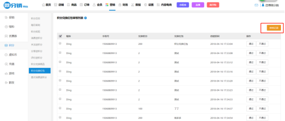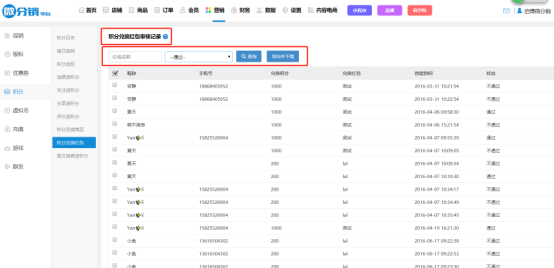 操作步驟: 總部后臺→營銷→積分→積分兌換紅包:積分兌換紅包審核列表增加“審核記錄”,可根據查詢條件“紅包名稱”和“審核狀態”查詢記錄并導出相關審核記錄。