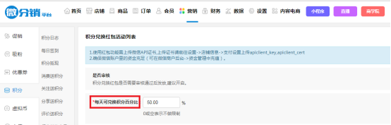 操作步驟: 總部后臺→營銷→積分→積分兌換紅包:可設置每天兌換積分百分比,0或空表示不做限制。