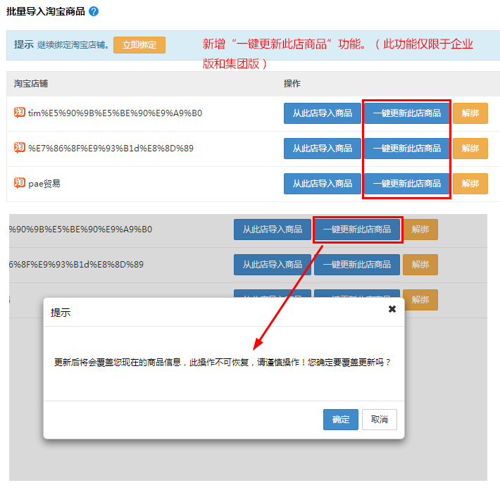 批量導(dǎo)入淘寶商品,需要先綁定您的淘寶店鋪。點(diǎn)擊立即綁定,綁定完成后,選擇從此店導(dǎo)入商品從淘寶店導(dǎo)入的商品,商品的右下角會(huì)有一個(gè)“淘”字顯示。并增加了“一鍵更新此店商品”的功能