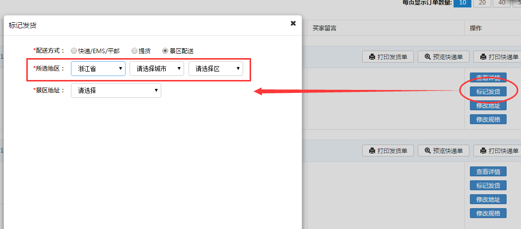 ·選擇標記發貨時,門店地址可以通過省市區篩選,便于門店較多的客戶選擇: