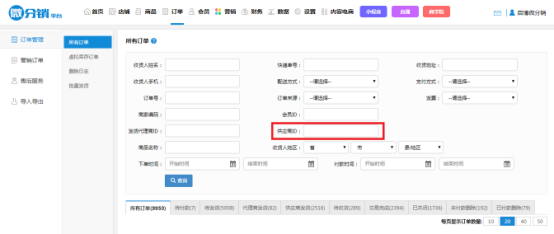 ·下面來看一下有關的查詢條件,我們可以根據以下查詢條件快速的查找到你想要找到的相關訂單。如下圖所示:根據“供應商ID”查詢,可查看相應供應商的訂單并進行管理