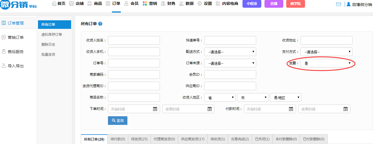·點擊選擇查詢項“發票”,選擇“是”,可查詢開發票的訂單: