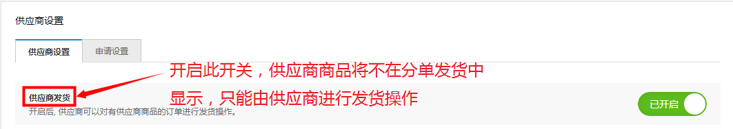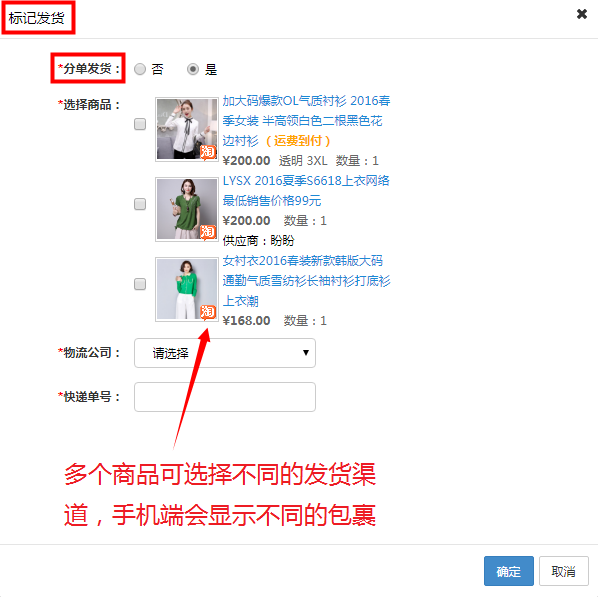 操作步驟:訂單可以選擇分單發貨,一筆訂單可以有多個物流單號,同時手機端會相應生成不同的包裹。只有訂單商品全部發完,訂單狀態才會變為待收貨。(注:當供應商發貨的開關開啟時,訂單中的供應商商品將不在分單發貨中顯示,供應商商品只能由供應商進行發貨操作)