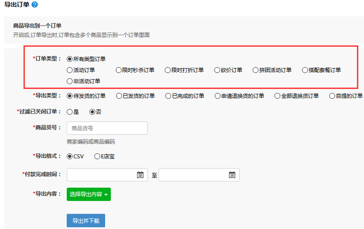 1.商品導出到一個訂單,開啟后,訂單導出時,多個訂單商品顯示到一個訂單里面,可以設置導出類型、商品類型、付款完成時間進行訂單導出。