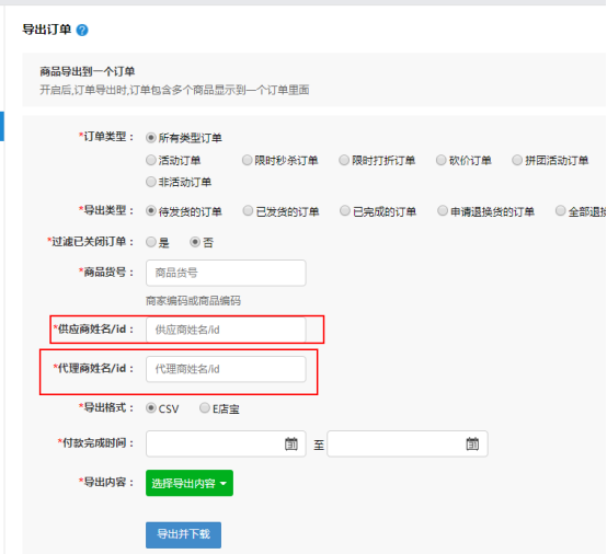 ①增加按搜索“供應商(名稱/id)”篩選導出供應商發貨的訂單 ②增加按搜索“代理商(名稱/id)”篩選導出代理商發貨的訂單