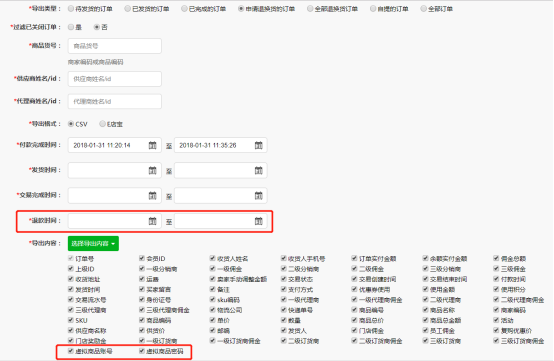 訂單導出內容,增加“虛擬商品賬號”和“虛擬商品密碼”的導出項;導出退換貨訂單時,可以選擇退款時間。