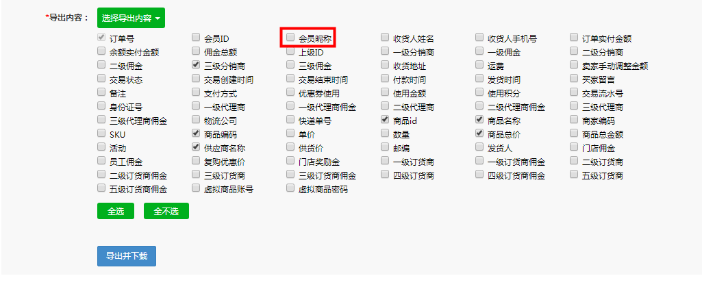 后臺訂單導出內容增加“會員昵稱”(總部后臺、代理商后臺、訂貨商后臺、供應商后臺及門店后臺)