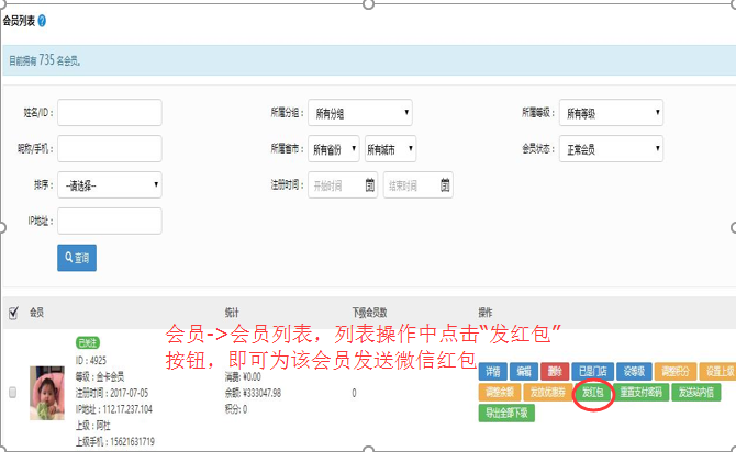 列表操作中點擊“發紅包”按鈕,即可為該會員發送微信紅包
