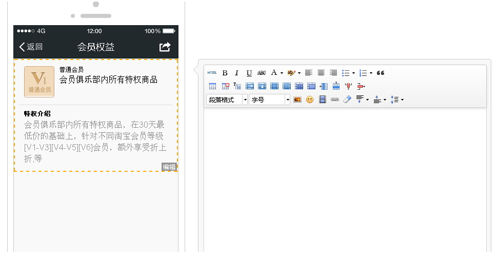 會員權益是管理員對會員等級所享受的福利補充,可在編輯器里對各個等級進行文字、圖片的描述。此部分內容顯示在“會員中心——會員等級與特權”頁面。