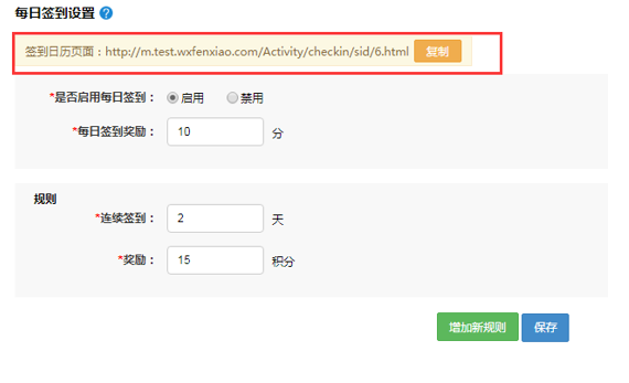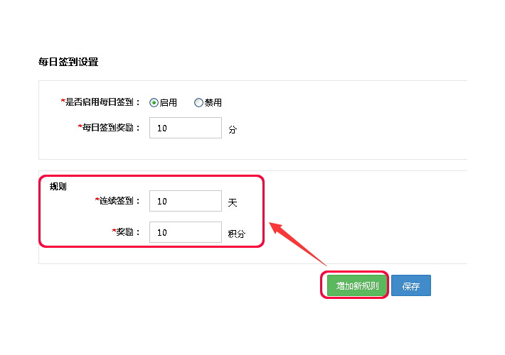 設置是否啟用每日簽到和每日簽到獎勵。還可以增加新規則,例如:連續簽到10天,獎勵10積分。點擊保存,每日簽到就設置完成了